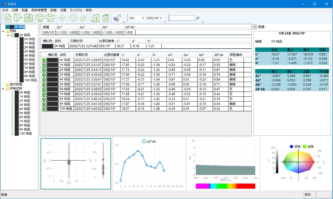 TS7036分光色差儀搭配的SQCX品質管理軟件,適用于各個行業(yè)的品質監(jiān)控和顏色數據管理。將用戶的顏色管理數據化,比較顏色差別,生成測試報告,提供多種色空間測量數據,定制化客戶的顏色管理工作。