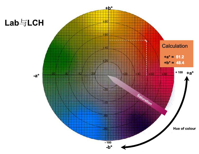 LCH是和Lab同樣的色度空間,只是LCH中L表示明度值;C表示飽和度值及H表示色調角度值得柱形坐標。現在很多色差計中都支持LCH顏色檢測標準的。下圖為Lab和LCH之間的關系。